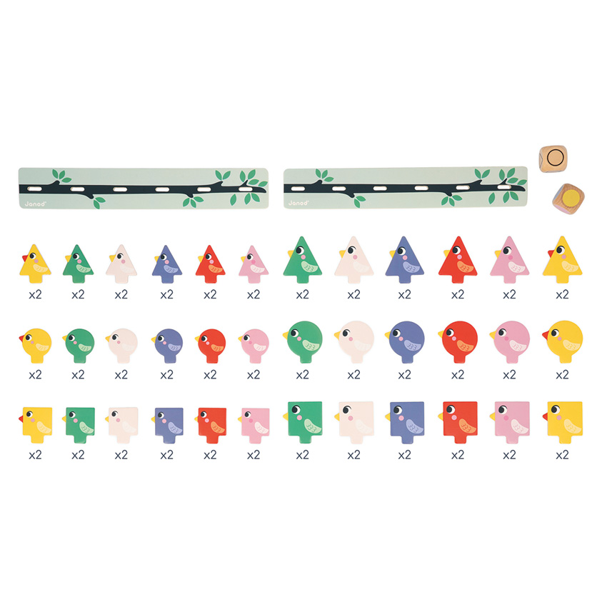 Shapes, sizes and colours will no longer be obstacles for your clever little ones, thanks to this wooden educational game from Janod. Children aged 2 years and up can learn to differentiate sizes, shapes and colours using the different birds in this fun game. This sorting game comprises 72 wooden birds: square, circular, big, small, green, blue, etc… they’ve gotten all mixed up, let’s help them find their family. Children will roll the dice to locate the desired colour, shape and size. They will be able to cross-reference this information and place the birds in question on the branch during independent play. With the use of the 2 branches 2 children can play at the same time and even challenge each other! In addition to learning shapes and colours this game is also ideal for developing hand-eye coordination. Made from FSC wood. It is part of an educational range developed in collaboration with a school teacher, in order to best match the learning and progress at each level.